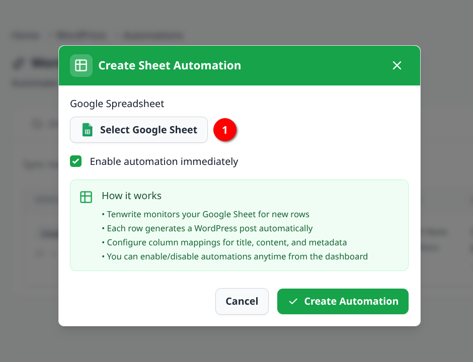 - You create a Sheet Automation in Tenwrite, linking the sheet to your WordPress sites.
